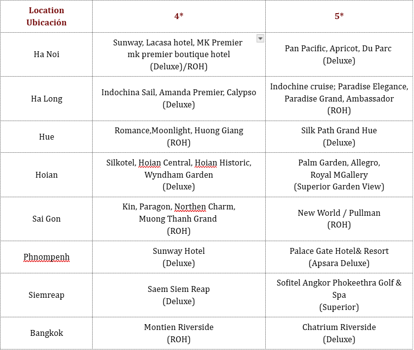 Los precios están expresados ​​en dólares estadounidenses por persona, en base a dos huéspedes compartiendo habitación doble o twin en los hoteles mencionados. Las tarifas a continuación no son válidas para Navidad, Año Nuevo (normalmente del 20 de diciembre al 10/15 de enero), Año Nuevo chino/vietnamita, Día de la Independencia (30 de abril), Primero de Mayo, Día Nacional (2 de septiembre), Año Nuevo Jemer (14-16 de abril), etc. Para más información sobre fechas específicas, contáctenos.