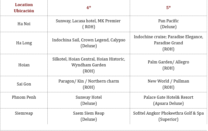 Los precios están expresados en dólares estadounidenses por persona, en base a dos huéspedes compartiendo habitación doble o twin en los hoteles mencionados. Las tarifas a continuación no son válidas para Navidad, Año Nuevo (normalmente del 20 de diciembre al 10/15 de enero), Año Nuevo chino/vietnamita, Día de la Independencia (30 de abril), Primero de Mayo, Día Nacional (2 de septiembre), Año Nuevo Jemer (14-16 de abril), etc. Para más información sobre fechas específicas, contáctenos.